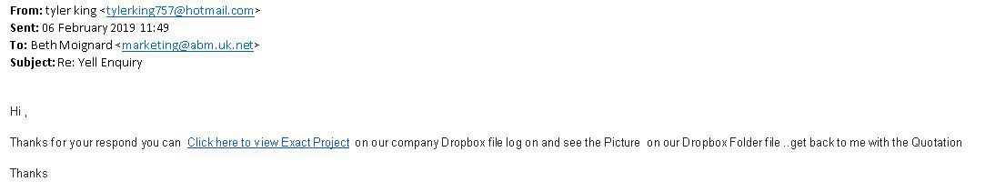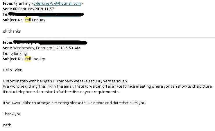 For those of you who aren’t familiar with Yell. Like the old directories, Yell hosts all company data. You can have a basic free appearance to add visibility to your business. Or you can pay to have a spot within a specified map region. This improves your visibility on Google and to people requiring your services in the area. The great thing about Yell is that you can monitor your progress, change your profile information, add photos and invite your customers to review you. Another feature of Yell is that people can contact you asking for your services. Most of the time it is effective, you contact the person back and start creating a business relationship. However, a percentage of the time you receive spam, or people trying to send you a virus and access your machine. So how does this scam work?
